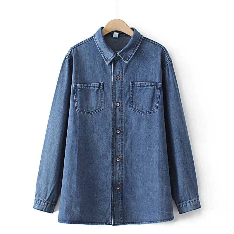 Autumn Jean Jacket Women Clothing Loose Fit Double Pocket Denim Coat Casual Long Sleeve Blue Outwear