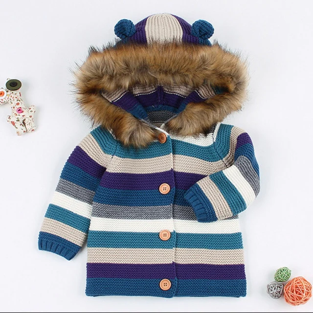 Children's Coat Sweater for Boy Girl Striped Fur Hooded Warm Knitted Jacked Infant Baby Cardigans 0-3Y