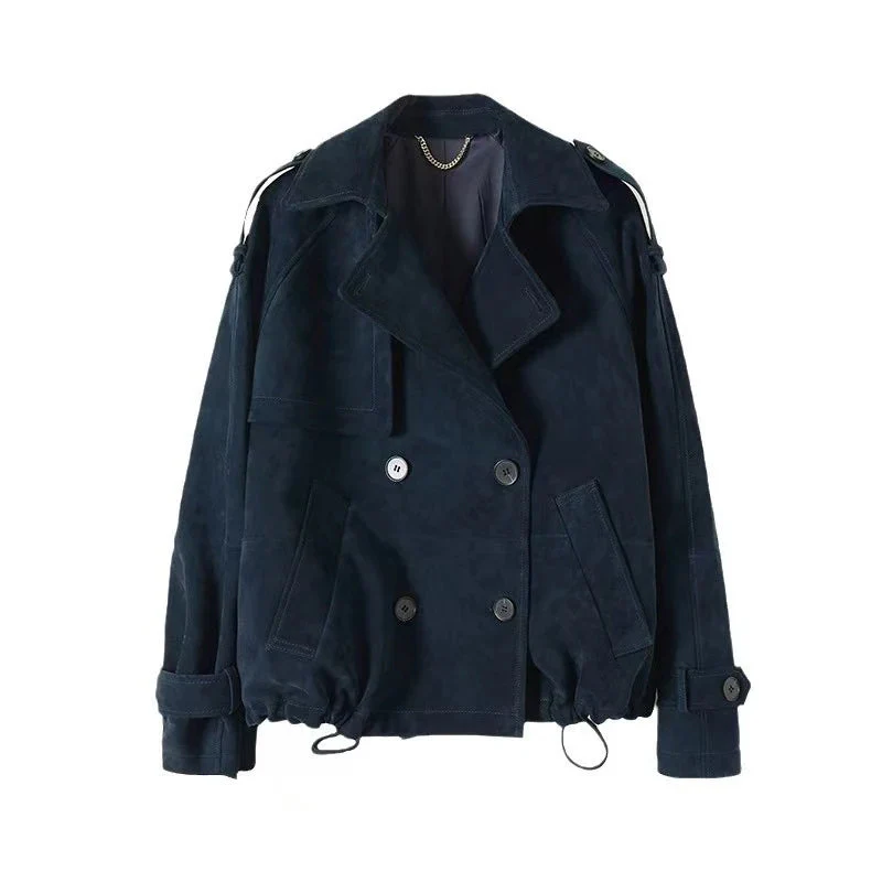 Kid Leather Jacket for Women Double Breasted Short Jacket Lapel Epaulet Trench Coat