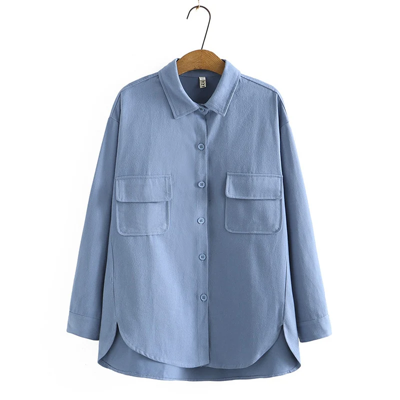 Long Shirt Women Clothing Cotton Two Pockets Fabric Blouses Casual Asymmetrical Length Tops Autumn