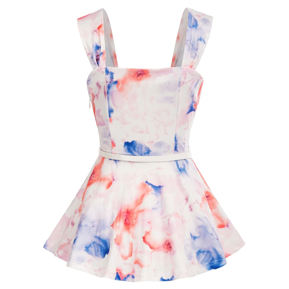 Summer Shirts Women Tie-dyed Peplum Tops Clothes Sleeveless Square Neck Belt Buttons Decorated Holiday Blouse Beach New