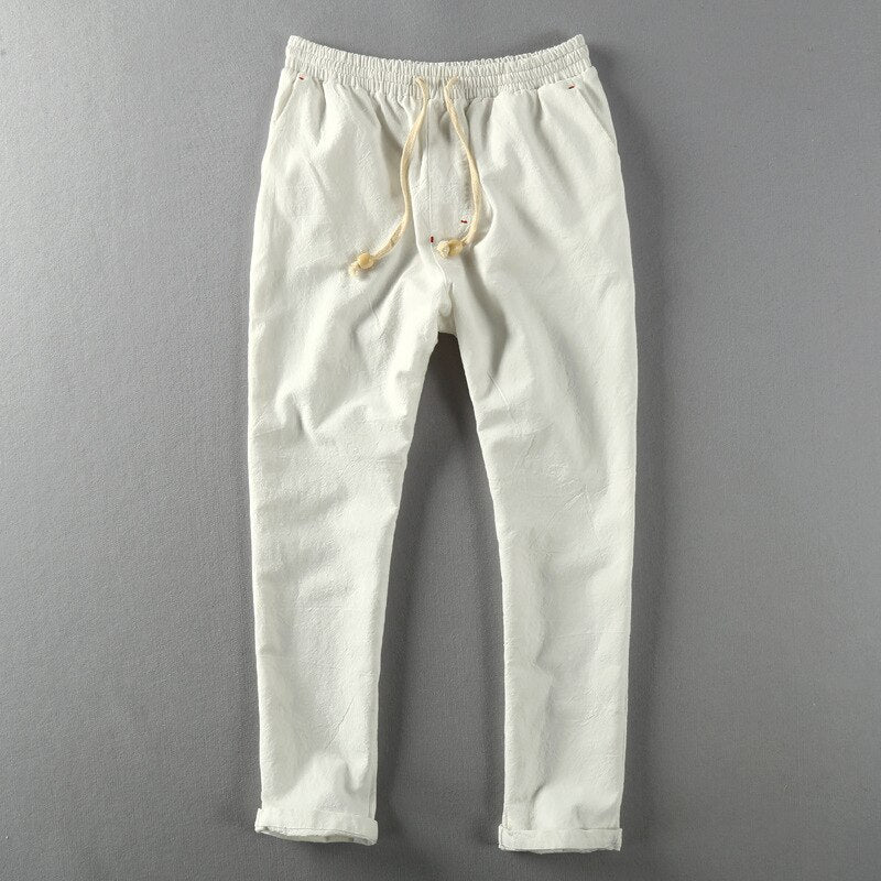 Men Linen Pants Casual Style Simple Sport Jogger Slim-Fit Thin Drawstring Stretch Waist Straight Ankle-Length Trouser