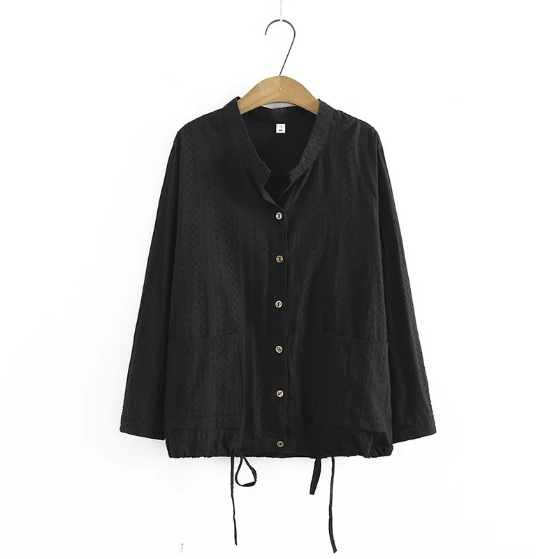 Women Clothing Shirts Autumn Jacquard Cotton Loose Casual Drawstring